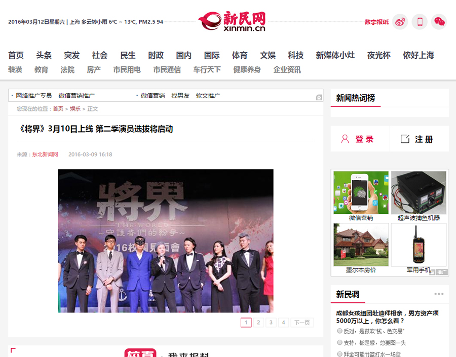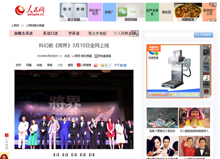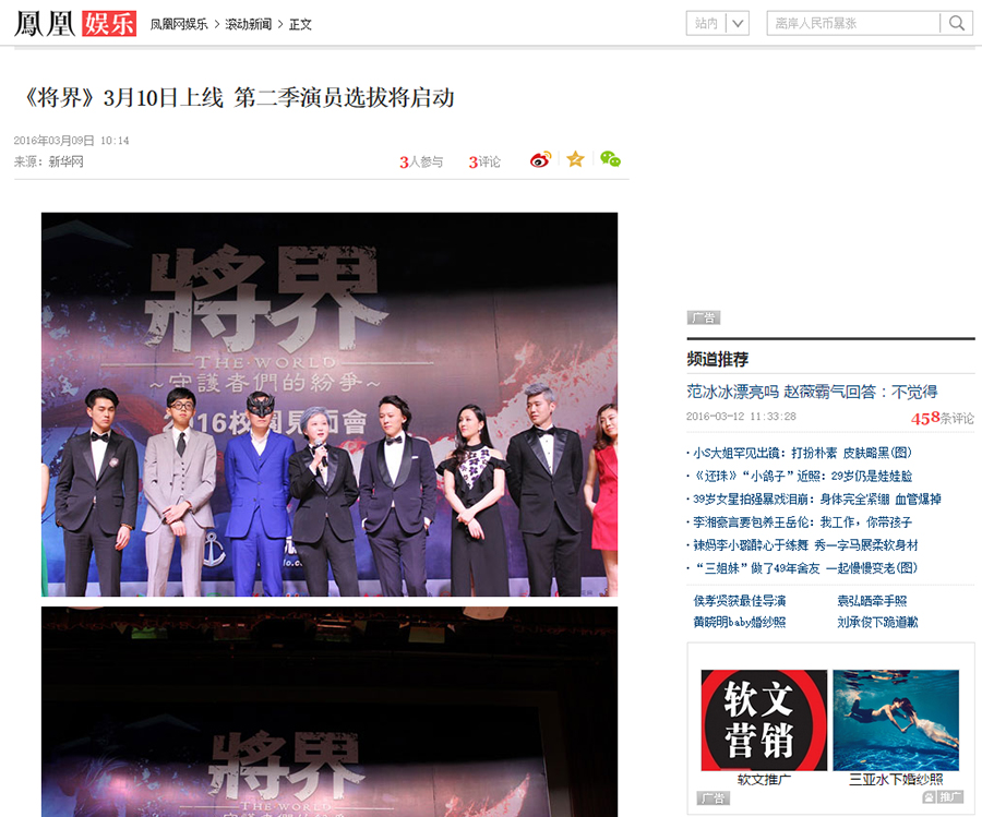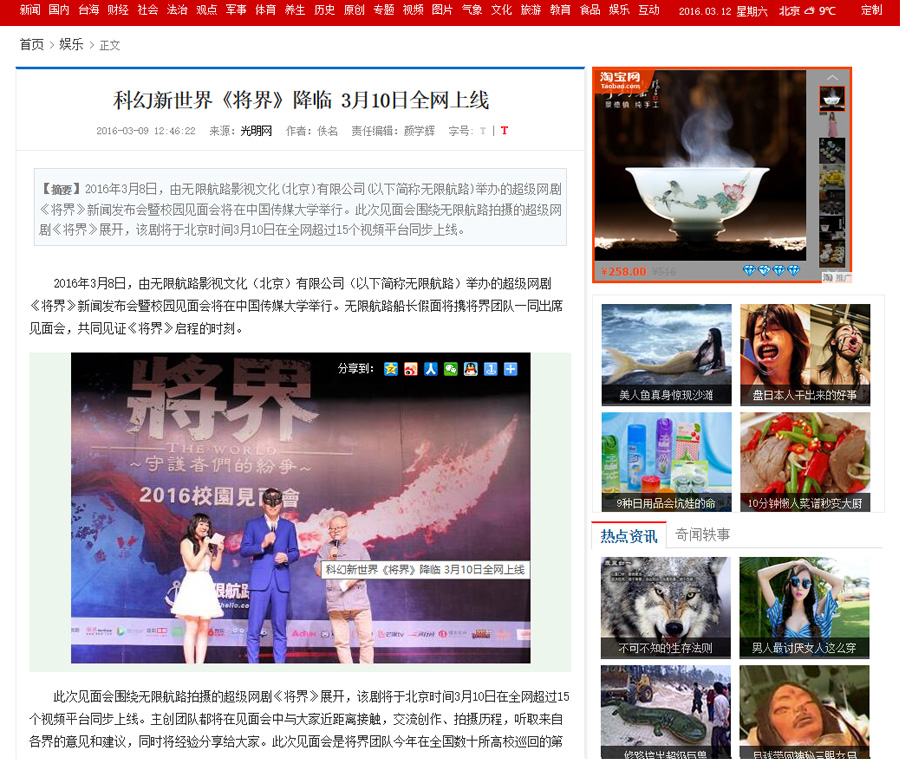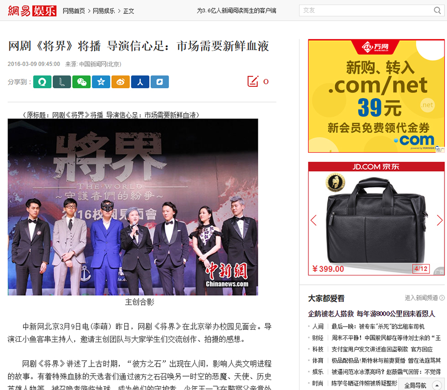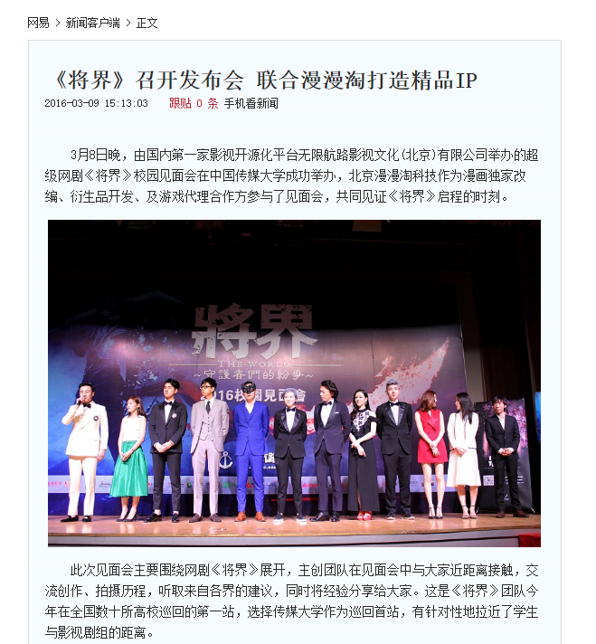 《将界》是一部网络剧,主要是网络上宣传,包括发布会全部委托给我们负责媒体邀约这块。以及网络宣传这块。总计执行了广州 中国传媒大学等不同地方的3场发布会。邀请数十家网媒报……