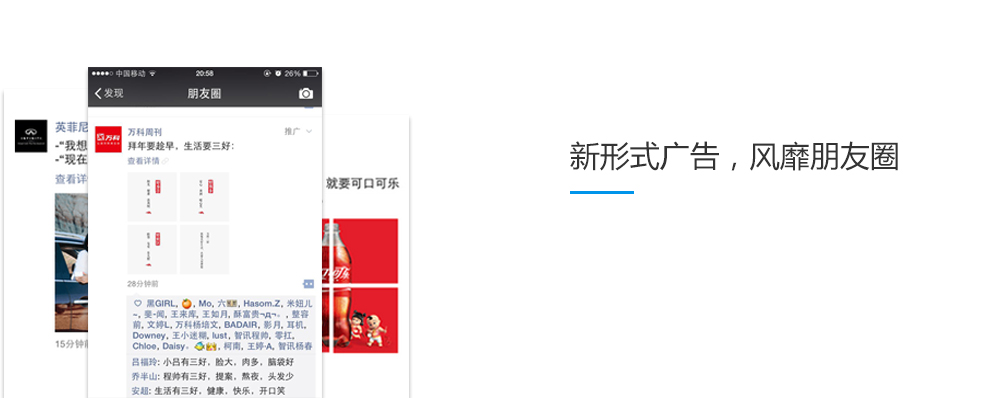 朋友圈广告将会通过微信广告系统进行投放和管理,广告本身内容将基于微信公众账号生态体系, 以类似朋友的原创内容形式进行展现,在基于微信用户画像进行定向的同时,依托关系链进行互动传播。