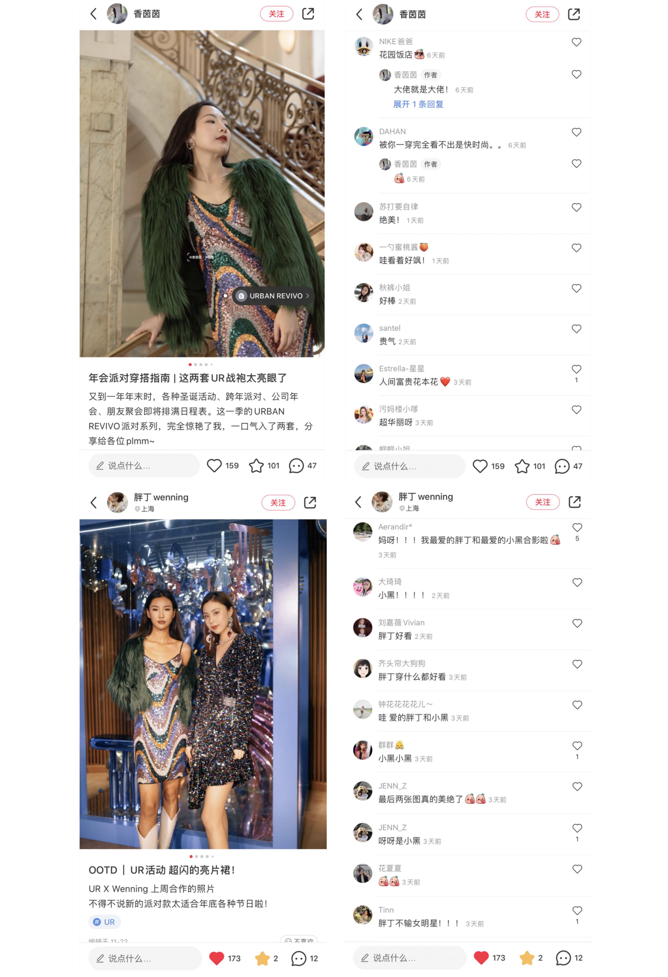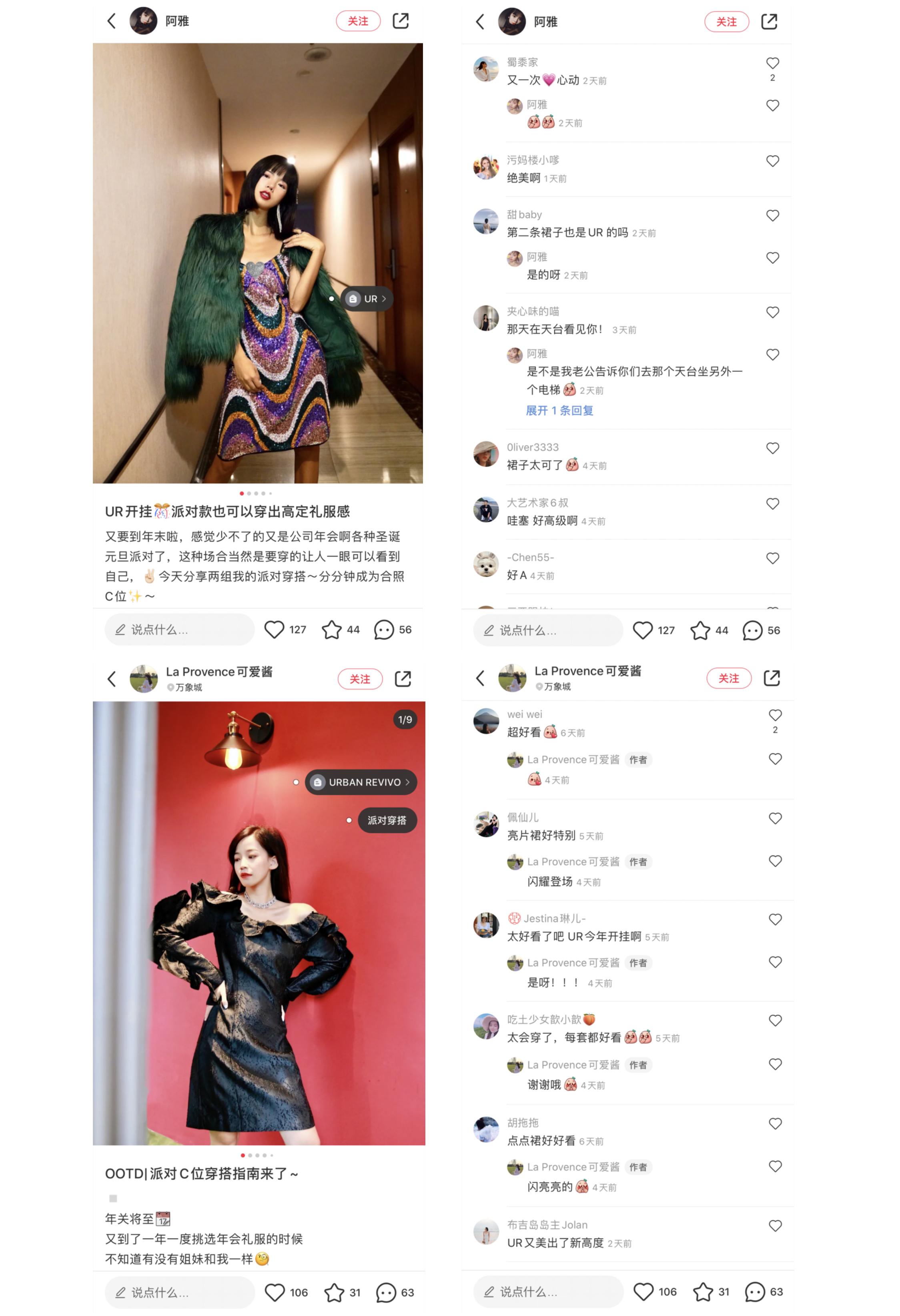 2.若干小红书达人笔记持续占据关键词“UR派对”“UR皮草”“UR亮片裙”等相关内容的前几位展示,从互动评论中可以看出,本次投放引导打卡的转化率在持续走高,陆续有素人晒出了新品的穿搭效果,大多数粉丝渴望打卡、愿意打卡
