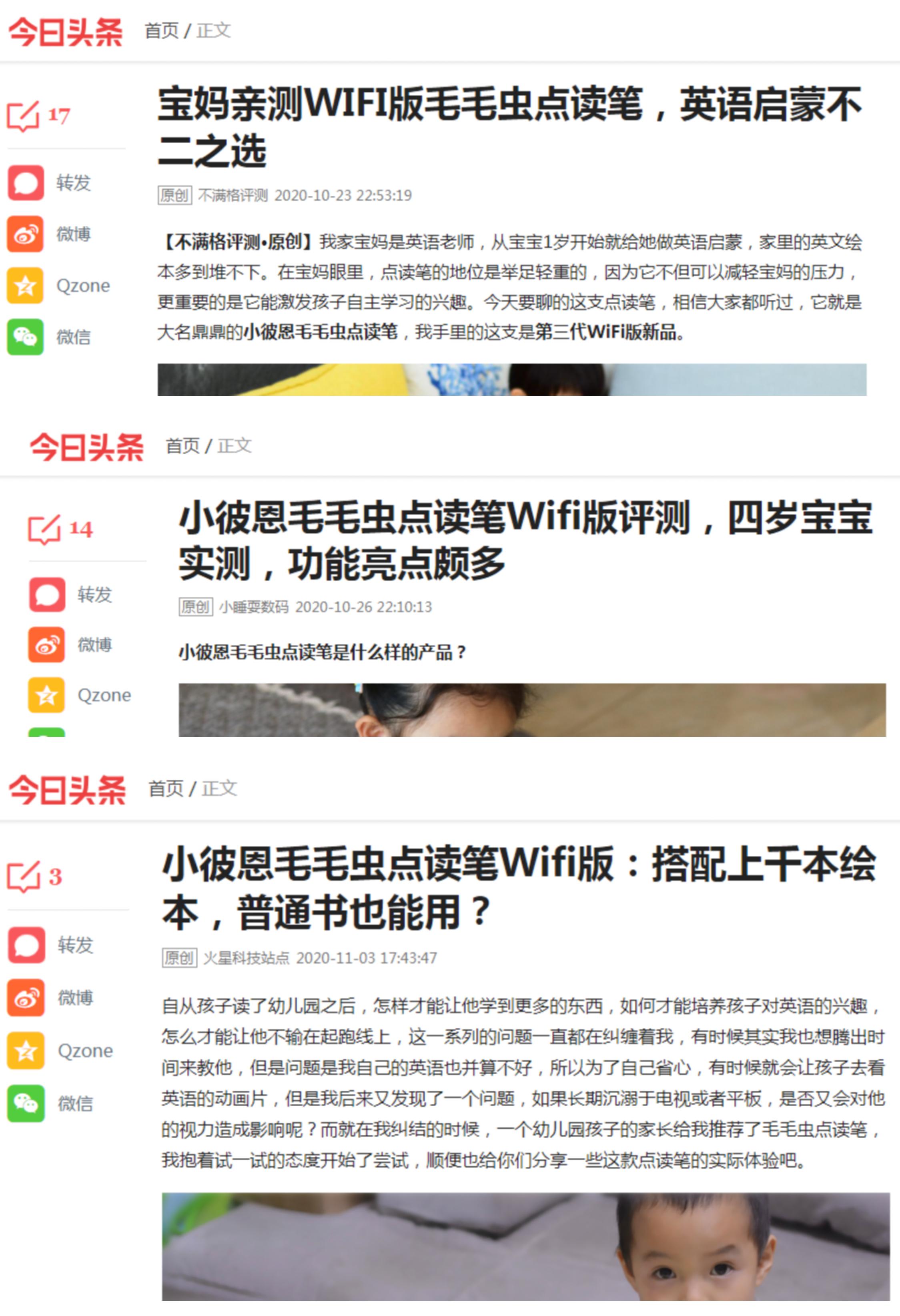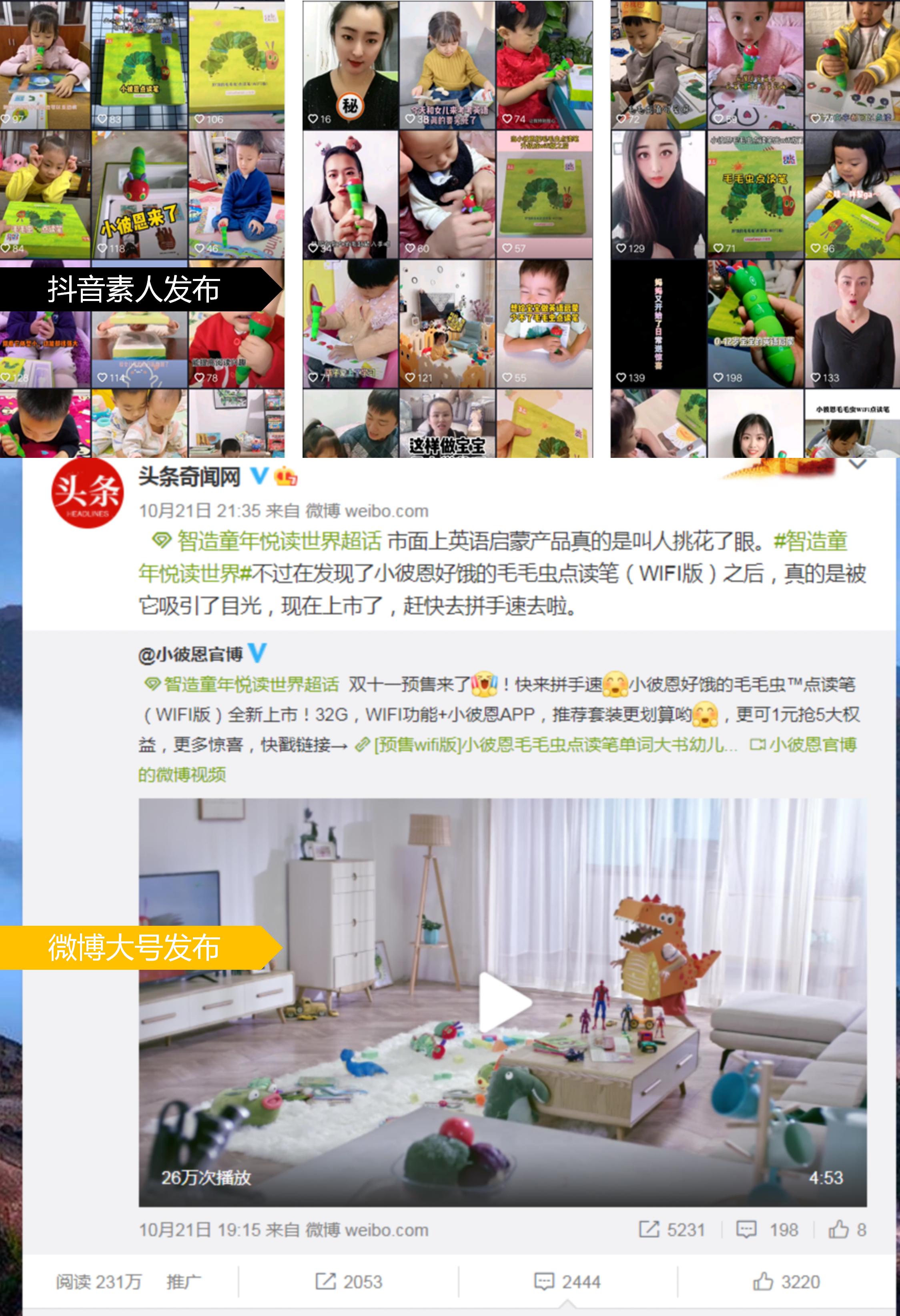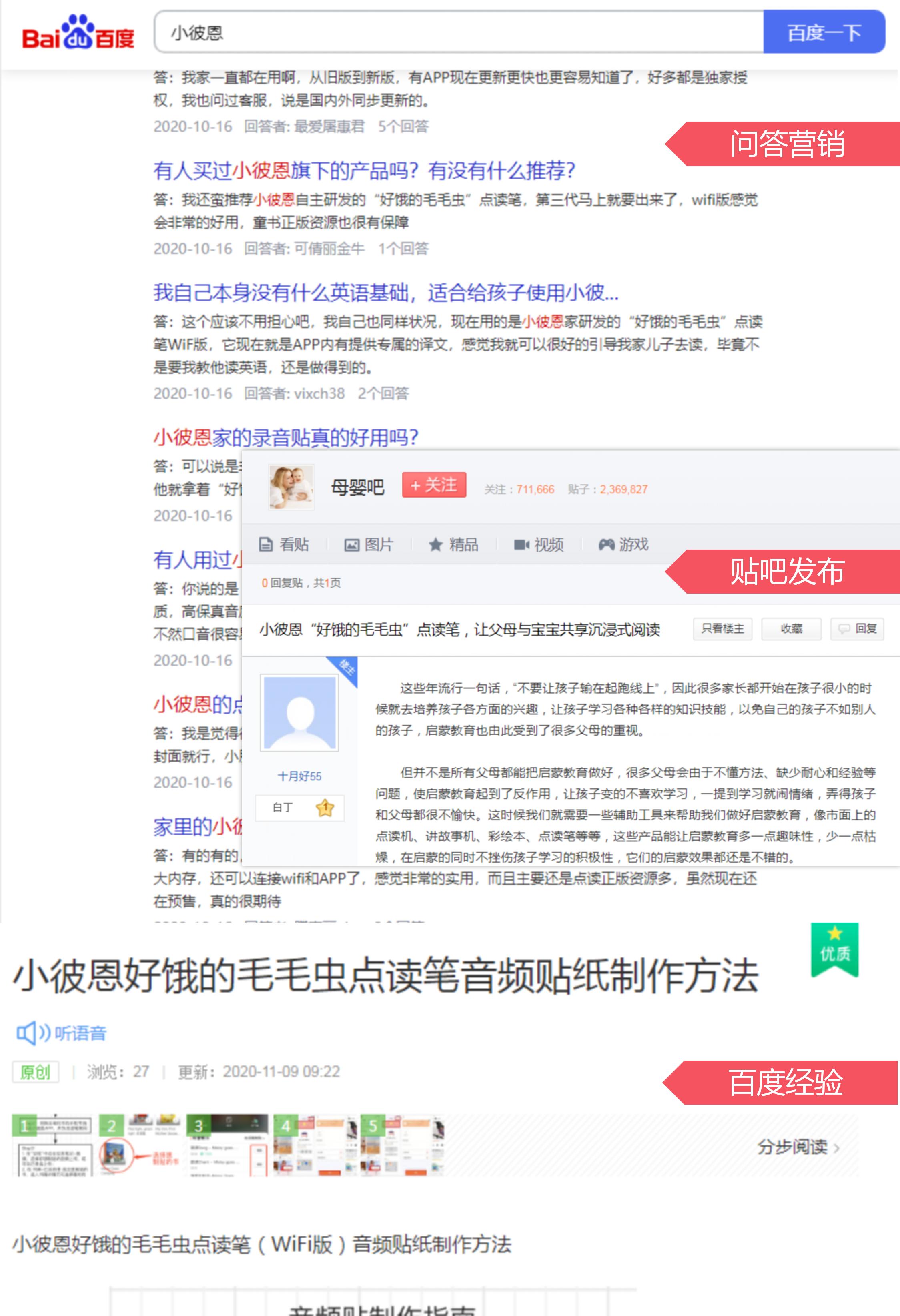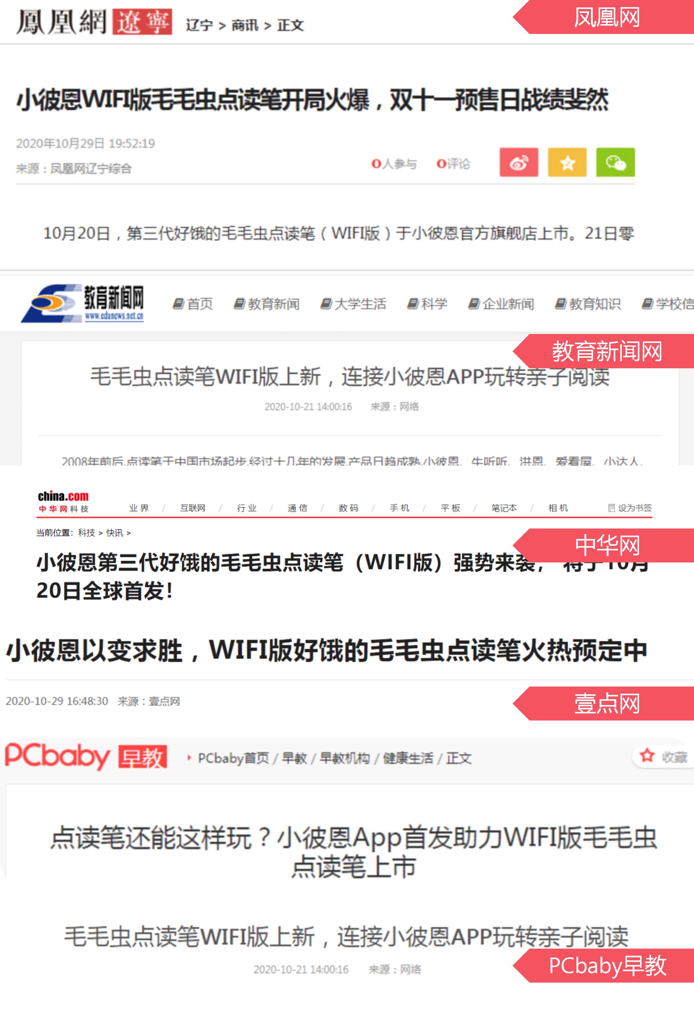 - • 推广效果 : 1.品牌得到相应曝光:小彼恩品牌及新品“好饿的毛毛虫WiFi版”在媒体、口碑、论坛优化推广,值得买、知乎产品测评及小红书、抖音种草领域达到良好的曝光,便于消费者对品牌产生认知和记忆。