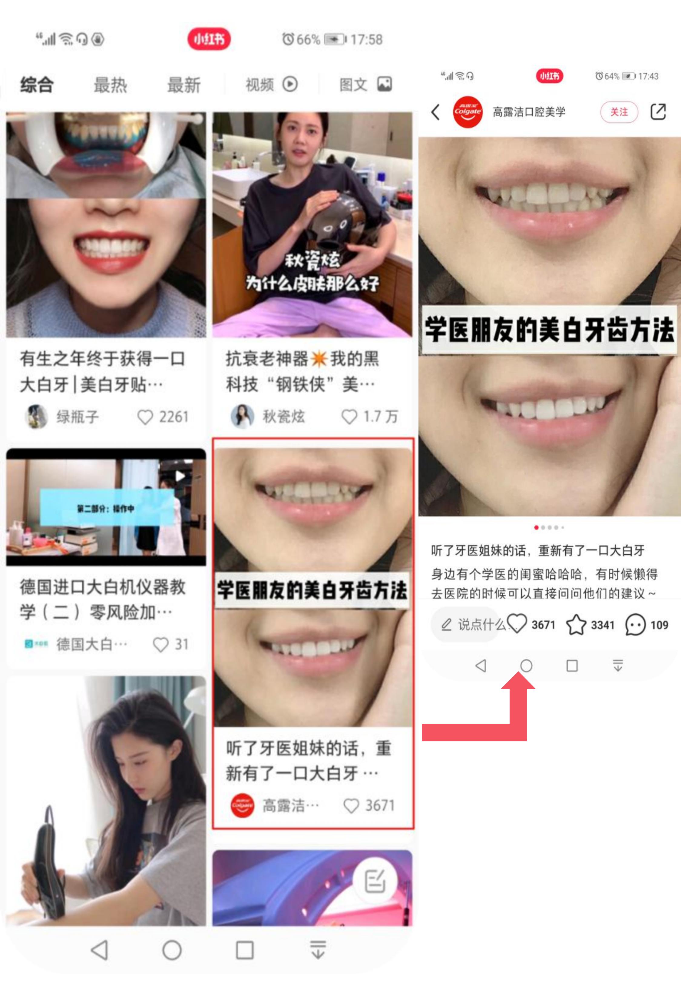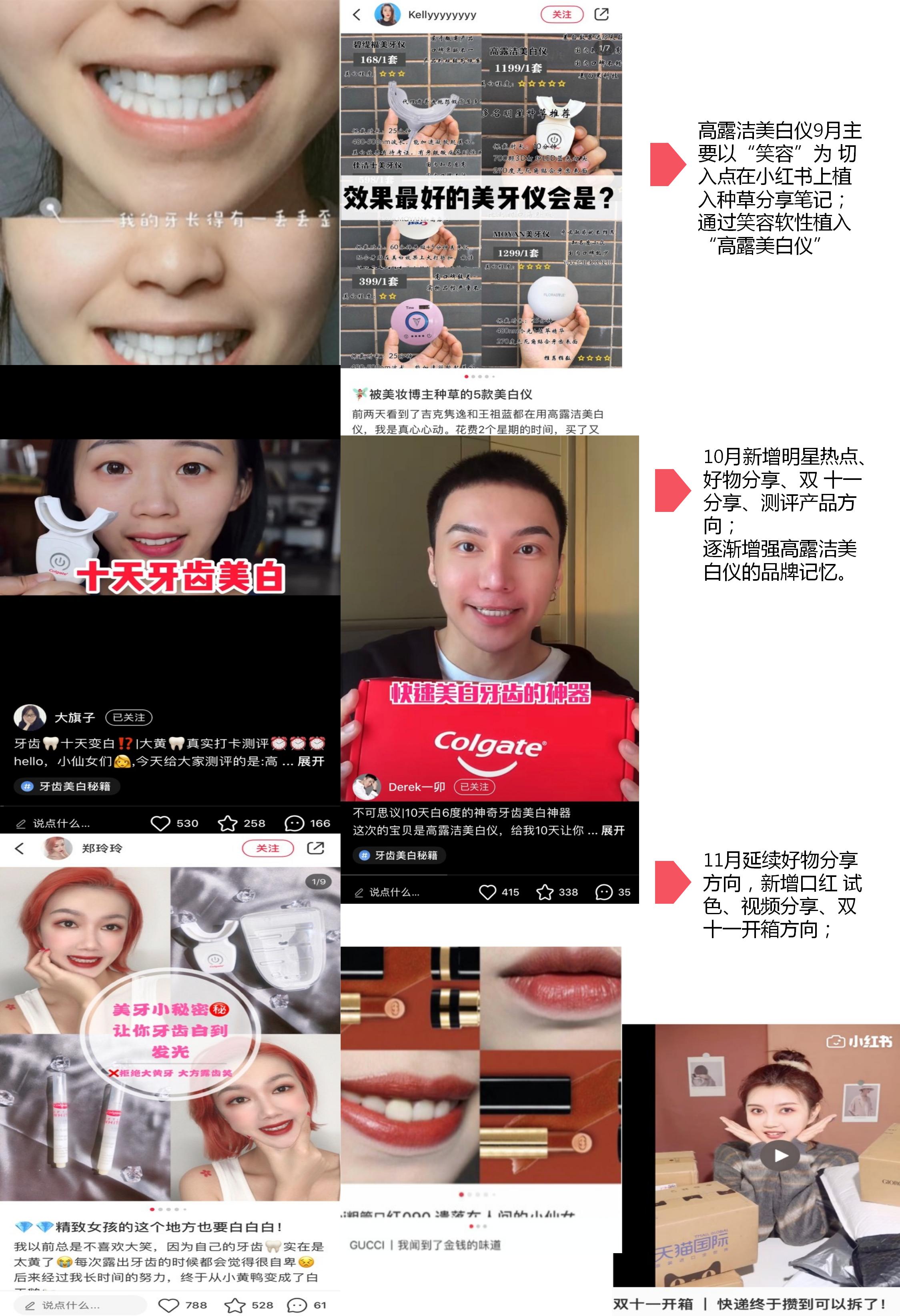 - • 营销策略 : 从用户痛点出发撰写内容,素人铺设品牌口碑产品声量,中腰部达人种草,头部达人形成领袖意见,实现带货,同时植入【高露洁美白仪】搜索关键词,引 导用户到天猫搜索促成转化。