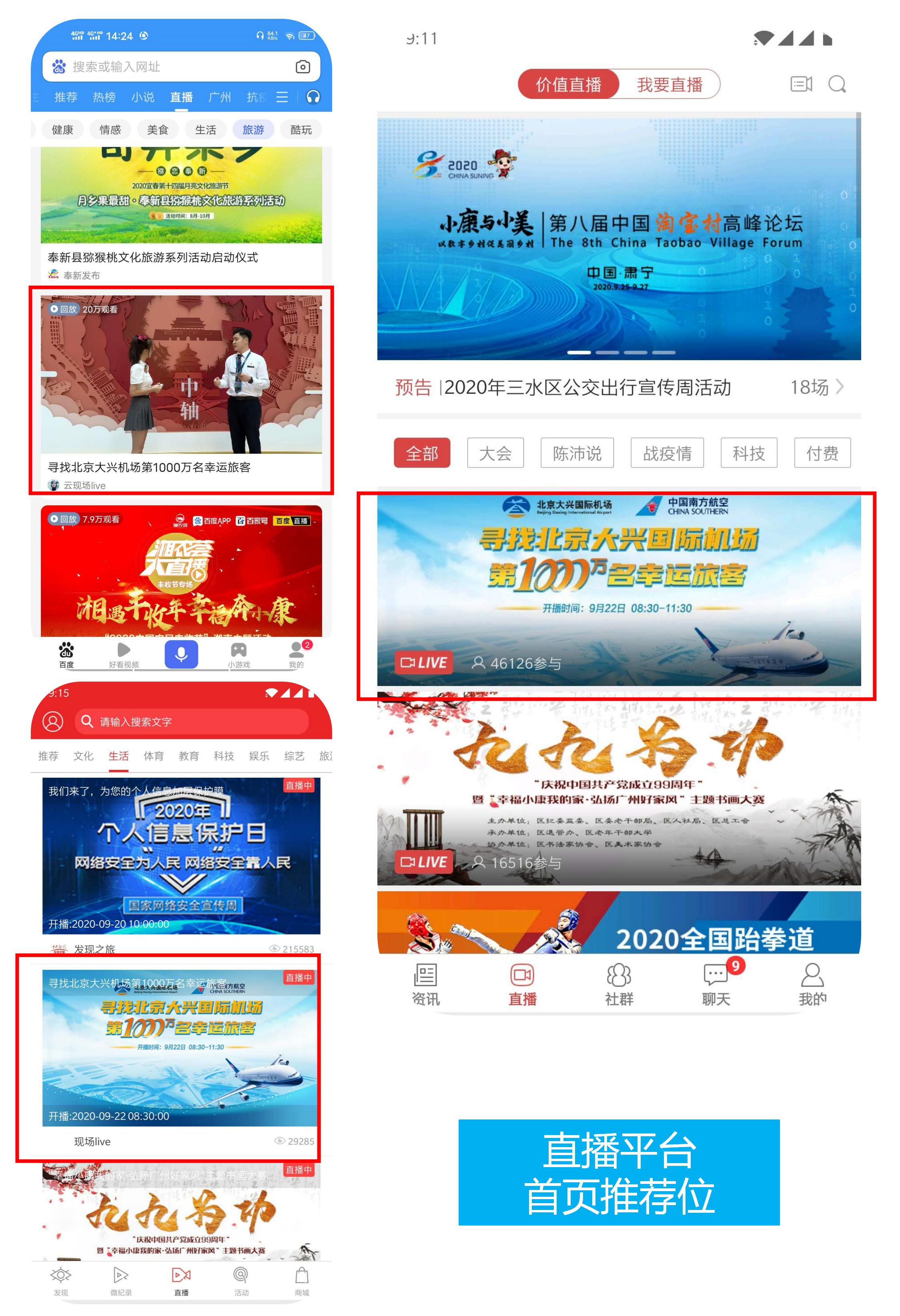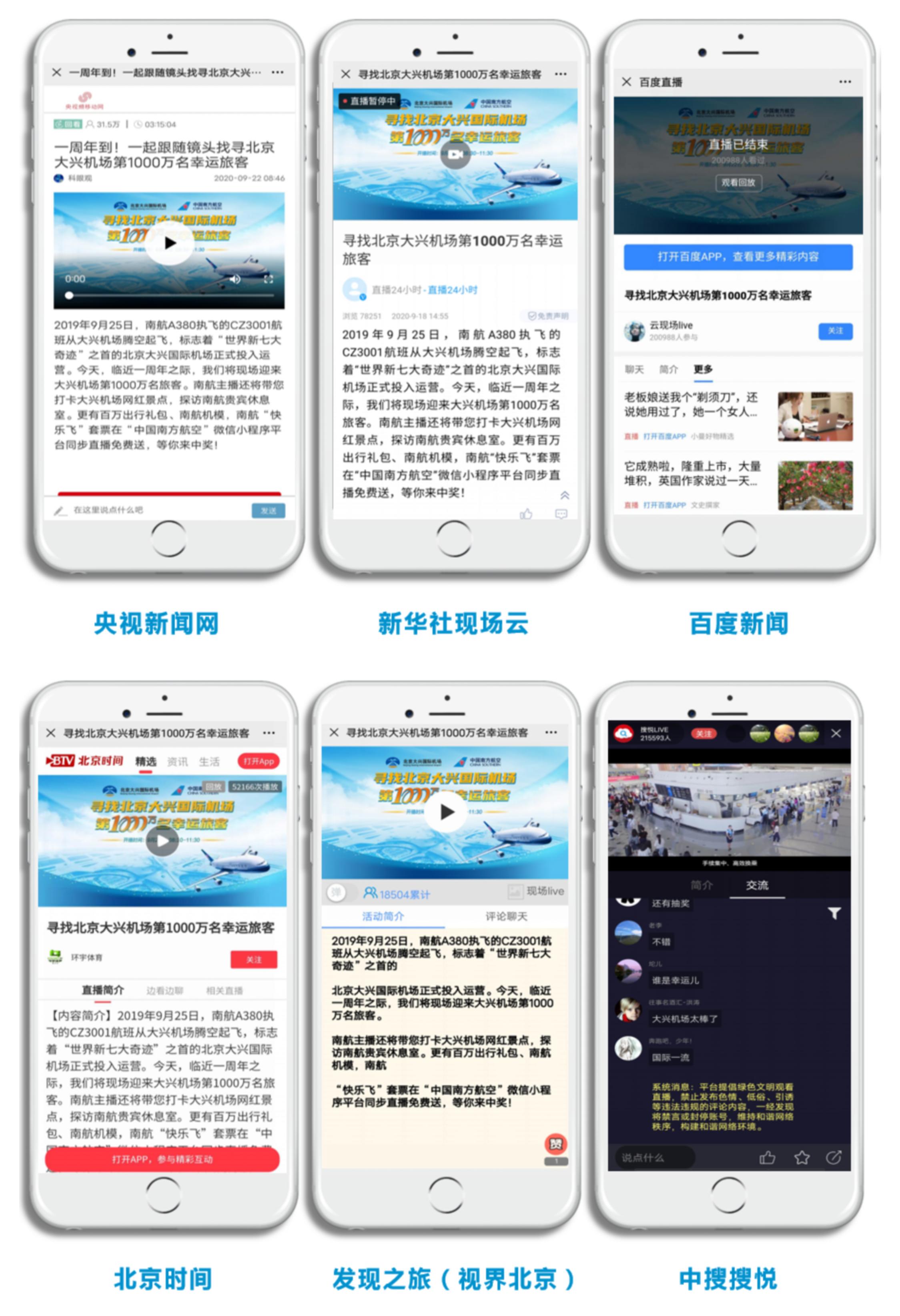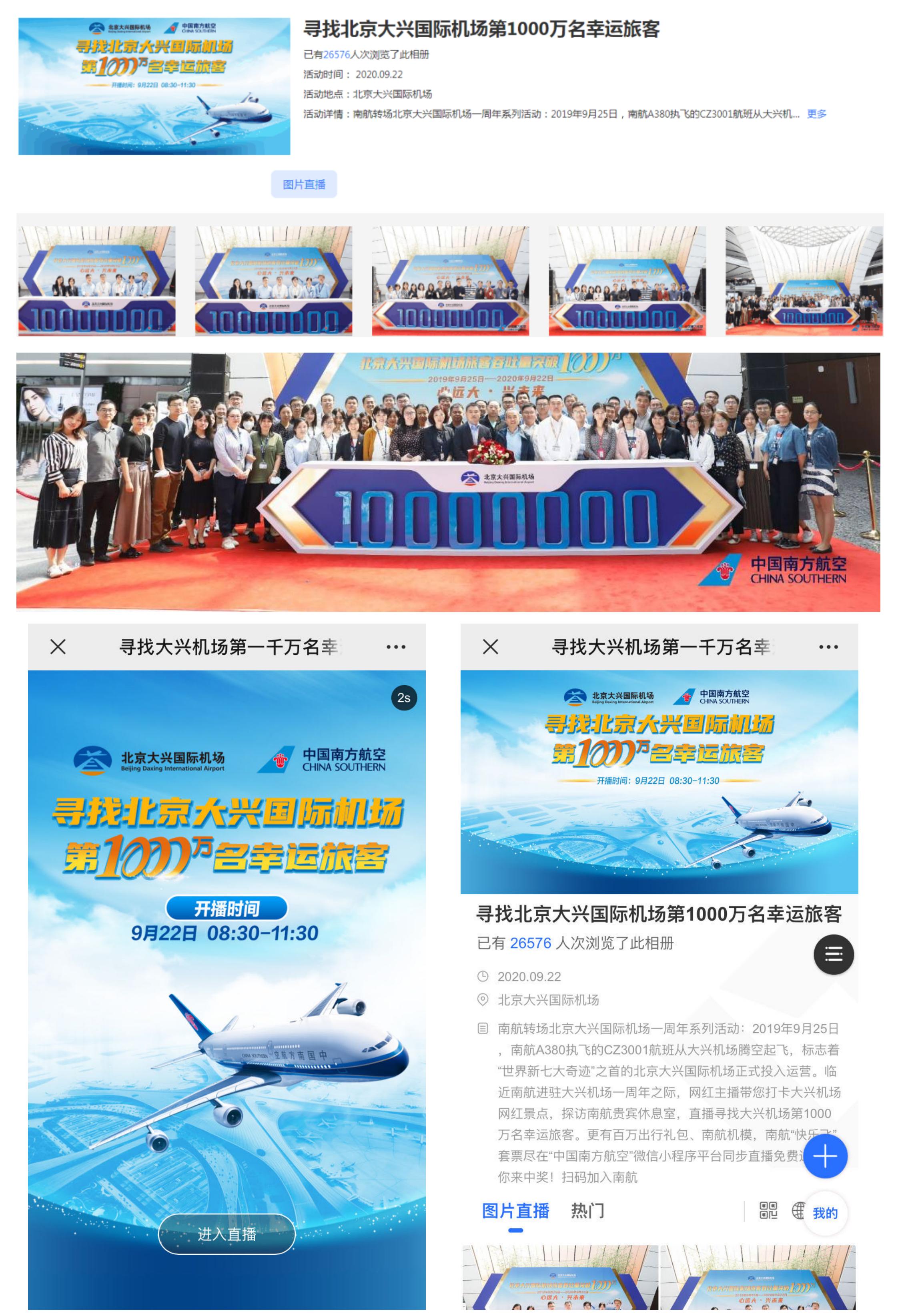 - • 案例背景 : 南航转场北京大兴国际机场一周年系列活动:2019年9月25日,南航A380执飞的CZ3001航班从大兴机场腾空起飞,标志着“世界新七大奇迹”之首的北京大兴国际机场正式投入运营。 临近南航进驻大兴机场一周年之际,网红主播带您打卡大兴机场网红景点,探访南航贵宾休息室,直播寻找大兴机场第1000万名幸运旅客。